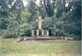 Am Marschberg: Steinmauer mit aufgesetztem Kreuz. Drei Wandtafeln. Vorplatz mit zwei Stufen zum Denkmal.