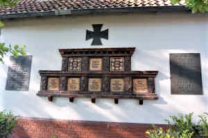 Wandplaketten an der alten Schule in Ingeln. Links und rechts Tafeln für den Zweiten Weltkrieg, in der Mitte Erster Weltkrieg.