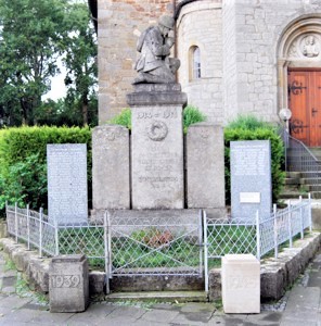 Die Denkmalanlage ist heute in Form eines Trapezes angelegt, dessen Seiten 3,50 m und dessen Vorderseite 2 m lang sind. Das aus Dolomit gefertigte Denkmal für die Gefallenen des Ersten Weltkrieges steht auf einem ca. 2 m breiten und 40 cm tiefen Fundament. Wie ein Triptychon sind darauf zwei Stelen und ein Pfeiler angeordnet. Er steht in der Mitte und ist 1,75 m hoch, 75 cm breit und 50 cm tief. Unter dem Kapitell wurden die Jahreszahlen „1914 = 1918“ erhaben herausgearbeitet. Darunter ist ein Kranz aus Eichenlaub dargestellt. Er hängt über der erhabenen Inschrift.