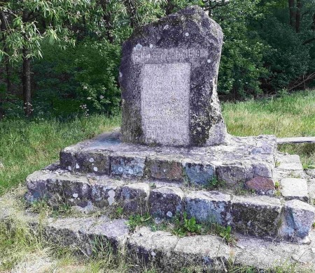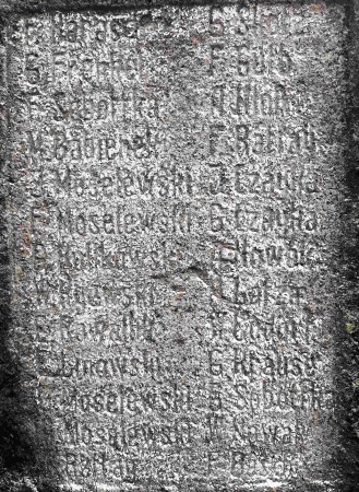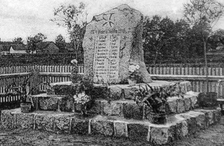 Nach 1945 wurde in Ostpreußen die deutsche Bevölkerung vertrieben und die meisten Denkmäler abgerissen, beschädigt oder umgewidmet. Hier ist das Denkmal noch erhalten, doch es verwittert, die Inschriften sind nicht mehr erkennbar und nur mit Hilfsmitteln ablesbar. Unsicherheiten konnten aus den offiziellen Verlustlisten des 1. Weltkriegs geklärt werden.