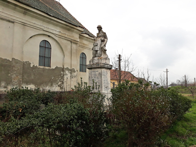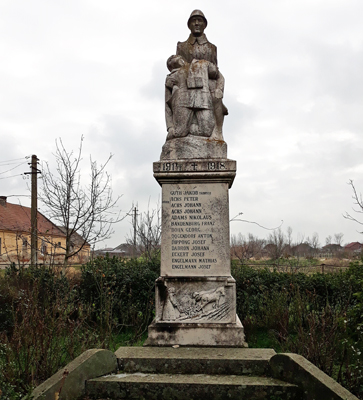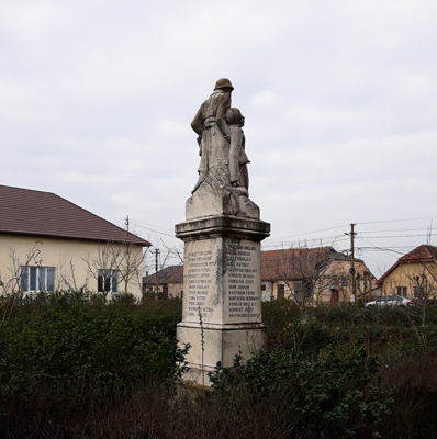 Auf dem Denkmal neben der Kirche steht ein lebensgroßer Soldat, der seinen gefallenen Kameraden hält.