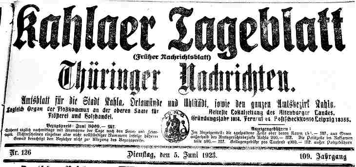 (Kahlaer Tageblatt. Thüringer Nachrichten, Nr. 126. 5. Juni 1923. 109. Jahrgang)