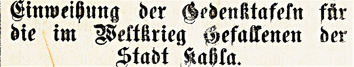 „1923 Am 3. Juni Einweihung der Gedenktafeln in der Stadtkirche für die im Weltkrieg gefallenen Angehörigen der Stadt durch Kirchenrat Burger. Auf 5 Gedenktafeln wurden 283 Namen verzeichnet. Die Tafeln befinden sich an der Nordwand des Schiffes, gegenüber der Kanzel (Entwurf und Ausführung der Tafeln in Muschelkalk-Kunststein durch Bildhauer Leidenfrost in Kahla). Die Namen der Gefallenen wurden mit schwarzer Farbe, die Überschrift über dem Ganzen in Gold abgesetzt. Hinter den Tafeln wurde eine Urkunde eingemauert mit Angaben über die Entstehung des Denkmals, Namen der Mitglieder des Kirchenvorstandes und der Kirchenvertretung, des Denkmalausschusses, der Geistlichen und sonst. Kirchenbeamten, des Bürgermeisters der Stadt, des Bildhauers und aller Mitarbeiter, ferner die amtlichen Angaben über den Dollar-Kurs und die gegenwärtigen Lebensmittelpreise, eine Sammlung von Notgeld der Stadt Kahla und der umliegenden Städte, sowie die Nr. 121 des Kahlaer Tageblatts.“