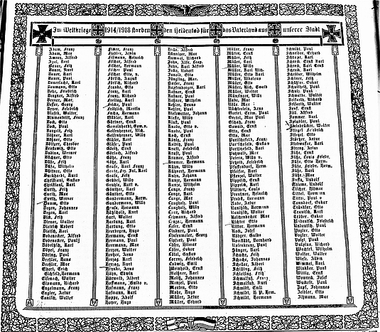 Sonntag, den 3. Juni, fand im Vormittagsgottesdienste die feierliche Einweihung der Gedenktafeln für unsere Gefallenen in der Stadtkirche statt. Die Tafeln waren mit einer Eichengirlande umgeben und die Wand, an der Nordseite der Kirche, in der sie aufgerichtet sind, mit Eichenkränzen geschmückt. Der Altarraum war mit Lorbeerbäumen besetzt, sodaß der hohe Raum sogleich einen dem Ernst der Feier entsprechenden stimmungsvollen Eindruck machte. […] Herzlicher Dank gebührt nun allen, die zu der Vollendung des Werkes beigetragen haben, den gütigen Gebern, die seit mehreren Jahren und besonders in dieser Osterzeit ihre Spenden darbrachten, den kirchlichen Körperschaften, die freudig den Platz in der Kirche zur Verfügung stellten, dem Denkmalsausschuß des Kirchenvorstandes, die viele vorbereitende Arbeit treffen mußte, Herrn Bildhauer Leidenfrost, der die Gedenktafeln künstlerisch entwarf […].“