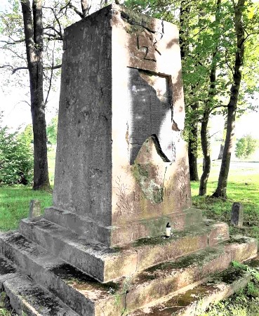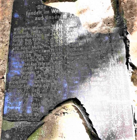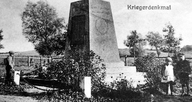 Nach 1945 wurde in Ostpreußen die deutsche Bevölkerung vertrieben und die meisten Denkmäler abgerissen, beschädigt oder umgewidmet. Hier steht das Denkmal noch in seiner äußeren Form. Die Namenstafel ist aber teilweise zerschlagen und das Denkmal bröckelt an vielen Stellen. Von den Namen sind mindestens sieben verloren (Todesdaten und Dienstgrade teilweise vorhanden, aber hier nicht aufgelistet).