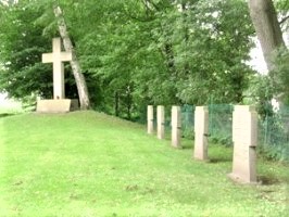 Auf dem Kirchhof unter einem großen Steinkreuz 12 Steintafeln mit den 18 und 64 Namen der Kriegstoten beider Weltkriege.