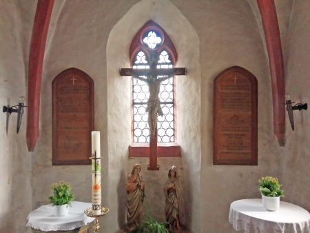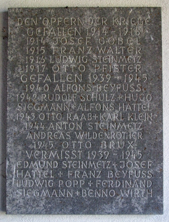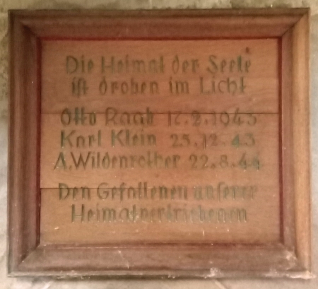 In einer Kapelle rechts vom Altarraum der Kirche St. Vitus hängen drei Holztafeln mit den Namen und Sterbetagen der Gefallenen und Vermissten beider Weltkriege.