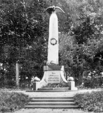 Ehemaliges Denkmal für die Gefallenen des Ersten Weltkriegs: Unterbau mit vier geschwungenen Seitenflügeln mit Kugeln an den Enden. Darauf ein Obelisk mit Stahlhelm-Plastik und Ehrenkranz, gekrönt von einem Adler.