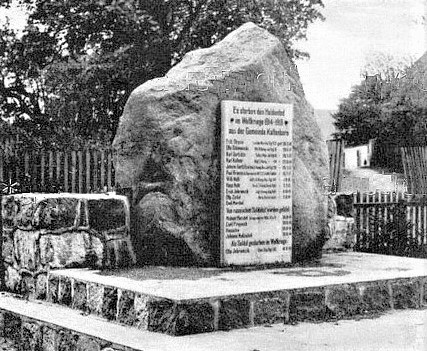 Ehemaliges Denkmal für die Gefallenen des Ersten Weltkriegs am Rande des Dorfes: Großer Felsblock mit angebrachter Widmungs- und Namenstafel. Die Tafel wurde nach 1945 zerstört.