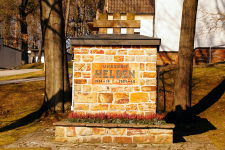 Massiver Steinquader in einer kleinen Anlage vor der Kirche St. Michael. Vorne die Widmung, an den Seiten drei Namenstafeln.