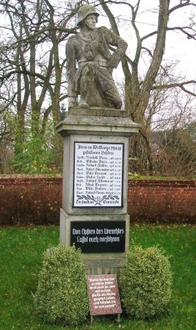 Denkmal für die Gefallenen des Ersten Weltkriegs: Abgestufte Stele mit krönender Figur eines knienden Soldaten mit Stahlhelm, Gasmaske um den Hals und Handgranate in der Hand.
