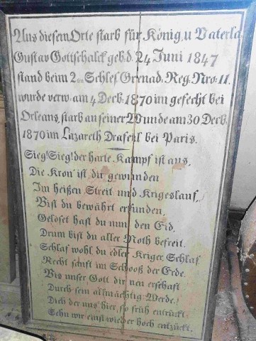 Zu den Gefallenen der Kriege 1813-1815 und 1870/71 konnten aus dem Kirchenbuch ergänzende Daten gewonnen werden. Die Gedenktafeln sind nicht in der Kirche aufgehängt, sondern im Dachaufgang abgestellt.
