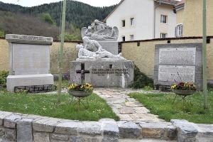 Auf einem Sockel neben der Kirche die Skulptur zweier Soldaten. Darüber und dahinter die Skulptur eines liegenden Soldaten mit zwei Engeln und einer knieenden Frau.