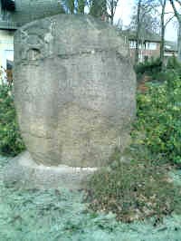 Roh behauener großer Findling in einer kleinen Anlage in der Ortsmitte von Kirchsteinbek.