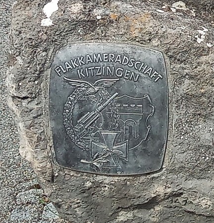 Auf einer niedrigen Steinumrandung sind 25 Metalltafeln mit den Namen und Lebensdaten um einen Kalksteinfindling herum angeordnet. An der Stirnseite, mittig liegend, eine Steintafel mit den Daten eines weiteren Gefallenen. Auf dem Findling sind eine Gedenkinschrift (aufgesetzte Metallbuchstaben) und das Wappen der Kameradschaft (Kitzinger Stadtwappen, 8,8cm Flak in einem Eichenkranz, einem Adler und einem Eisernen Kreuz) angebracht.