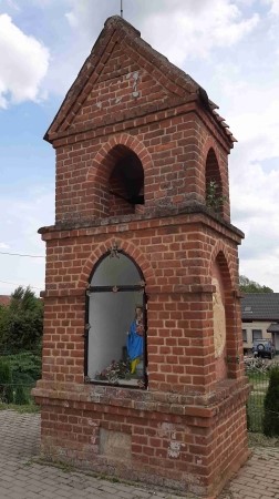 Denkmal für die Gefallenen des Ersten Weltkriegs: Abgestufter viereckiger Turm aus Klinkern mit eingelassener Widmungs- und Namenstafel aus Holz (stark verwittert). In einer Nische ist eine Marienfigur aufgestellt.