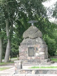 Auf der Vorderseite des Findlings ein gemeißeltes Eisernes Kreuz, auf der Spitze des Findlings die Plastik