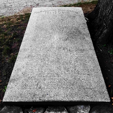 Denkmal für die Gefallenen des Ersten Weltkriegs: Große Granitplatte mit EK-Zeichen im oberen Bereich, umgestürzt flach auf dem Boden liegend.