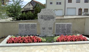 Steintafel bei der Kleinengstinger Kirche. In der Mitte eine Steinplatte mit einer Inschrift, linke Steintafel mit den Namen des Ersten Weltkriegs, rechte Steintafel mit den Namen des Zweiten Weltkriegs.