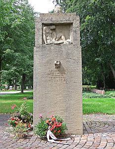 Steinsäule mit Inschrift, darüber eine nackte liegende Männerfigur, als Abschluss ein Stahlhelm.