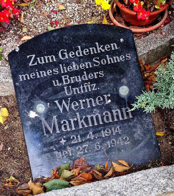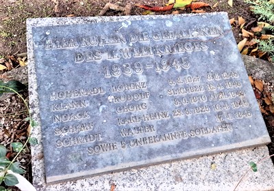 Vor christlichen Kreuzen liegt die Tafel mit den Namen der hier bestatteten Soldaten sowie zwei Gedenktafeln.