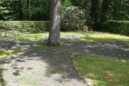 Am Doniswald: Am Boden ein aus Kies und Steinen geformtes Eisernes Kreuz, in der Mitte ein Baum, dahinter ein Gedenkstein.