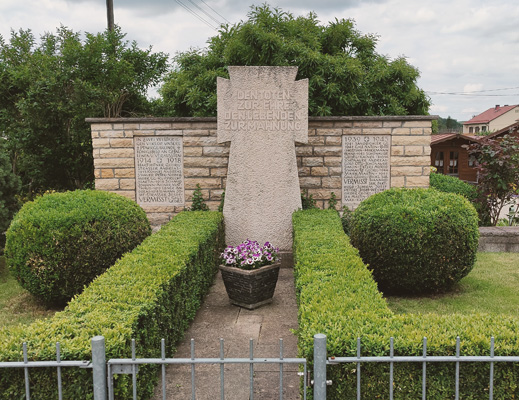 Gedenktafeln für den 1. Weltkrieg in der Kirche. Denkmal für beide Weltkriege auf dem Kirchenfriedhof.