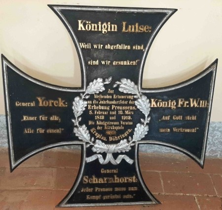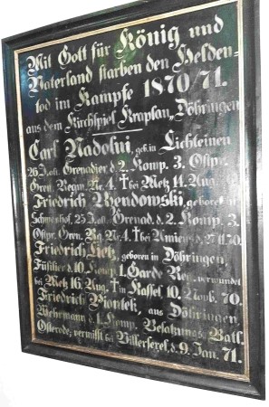 Gedenktafeln in der Kirche für Gefallenen des Krieges 1870/71 und des Ersten Weltkrieges. Außerdem ein Gedenkkreuz zum 100jährigen Jubiläum des Beginns der Befreiungskriege 1813 in Form eines großen Eisernen Kreuzes.