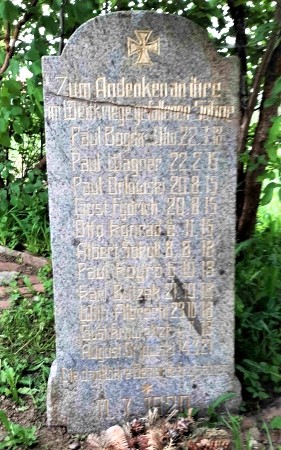 Denkmal für die Gefallenen des Ersten Weltkriegs auf dem alten evangelischen Friedhof in Form einer aufgerichteten Granitplatte mit EK-Zeichen im oberen Bereich.
