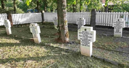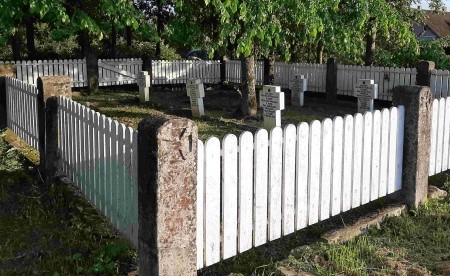 Kriegsgräberstätte für Gefallene des Ersten Weltkriegs mitten im Dorf: Kleine eng umzäunte Anlage mit sechs Grabkreuzen. Hier ruhen 58 deutsche Soldaten, davon 35 unbekannt.