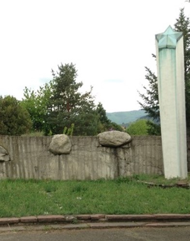 Das Denkmal schließt eine grobe Betonwand mit eingelassenen Findlingen ab. Auf den Findlingen die Jahreszahlen 1944 und 1945 und kyrillische Inschriften. Rechts ein Obelisk mit einem Stern als oberen Abschluss. Davor ein Grabmal beschriftet mit der Jahreszahl 1941 und den Namen von 16 deutschen Soldaten.