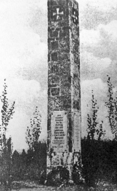 Nach 1945 wurde in Ostpreußen die deutsche Bevölkerung vertrieben und die meisten Denkmäler abgerissen, beschädigt oder umgewidmet. Hier wurden die Tafeln vernichtet und es sind keine lesbaren Fotos oder Aufzeichnungen dazu auffindbar. Diese werden gesucht. Nur die EK-Zeichen oben erinnern noch an die ursprüngliche Bedeutung der Stele, die heute in einer verwilderten Ecke steht.