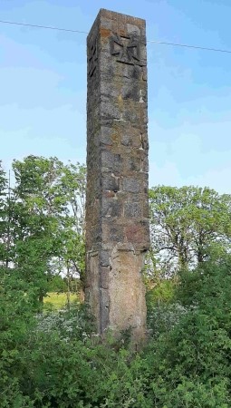 Denkmal für die Gefallenen des Ersten Weltkriegs: Hohe viereckige Stele mit EK-Zeichen an allen vier Seiten an der Spitze. Die Widmungs- und Namenstafeln fehlen heute.