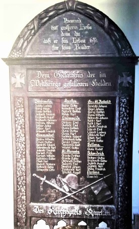 Gedenktafel für die Gefallenen des Ersten Weltkrieges in der evang. Kirche in Kurken. Die Tafel ist an den Rändern verziert und unten befinden sich Motive eines Stahlhelms mit Eichenlaub, Handgranate, Schwert und Fahne.