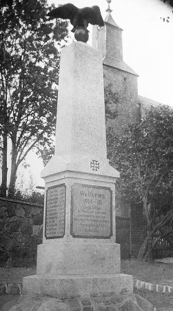 Ehemaliges Denkmal für die Gefallenen des Ersten Weltkriegs: Abgestufte Stele mit eingelassenen Widmungs- und Namenstafeln und krönendem Adler (abgerissen)