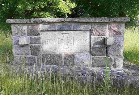 Kriegsgräberstätte für Gefallenen des Ersten Weltkriegs mitten im Dorf an der Hauptstraße: Aus Natursteinen gemauertes Eingangstor, Widmungsstein mit EK-Zeichen in der Mitte und Steinwand mit Relief von großem christlichem Kreuz für gefallene Jäger am Ende der Anlage. Die kleinen flachen Namenssteine der Gefallenen sind kaum noch zu lesen. Hier ruhen 54 deutsche und 89 unbekannte russische Soldaten.