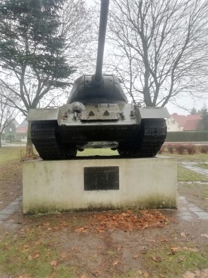 Das Panzerdenkmal wurde 1975 zum 30. Jahrestag des Endes des Zweiten Weltkriegs errichtet. Der auf einem Betonsockel aufgestellte sowjetische Panzer des Typs T-34 war 1945 an den Kämpfen um Berlin beteiligt und kam danach in den Bestand der NVA, die ihn für das Denkmal zur Verfügung stellte.