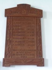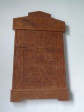Zwei aus Holz geschnitzte Gedenktafeln hängen links und rechts neben der Eingangstür an der inneren Wand der kleinen Halligkirche auf der Kirchwarf.