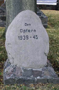 Ein Gedenkstein mit Namenplatte für die Toten des 1. Weltkriegs und ein Gedenkstein ohne Namen für die Opfer des 2. Weltkriegs.