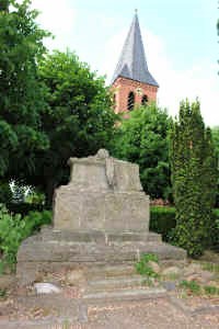 Vor der Kirche: Denkmal aus Stein, einem Sarkophag nachempfunden, oben ein Militärmantel mit Stahlhelm und Eichenlaub, darunter an den Seiten Inschrift und Namen.