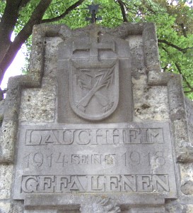 Krieger auf einem Steinsockel, darüber eine Inschrift Lauchheim 1914-1918, darauf das Wappen von Lauchheim mit Kreuz. Linke und rechte Seite am Denkmal eine Tafel mit den Namen der Gefallenen des Ersten Weltkriegs. Links vom Denkmal die Tafel der Vermissten, rechts die Tafel der Gefallenen des Zweiten Weltkriegs.