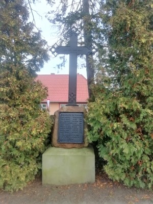 Findling mit Stahlplatte und Kreuz auf dem Friedhof an der Landstraße, Ecke Am Mühlenbach.