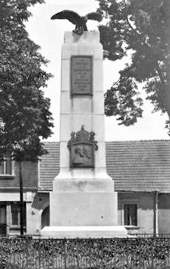 Ehemaliges Denkmal für die Gefallenen des Krieges 1870/71 auf dem Marktplatz: Abgestufte Stele mit krönendem Adler. Daran angebracht eine Widmungstafel und Plakette mit dem Bildnis der Kaiser Wilhelm I. und Friedrich III. mit Kaiserkrone. Das Denkmal wurde nach 1945 abgerissen.