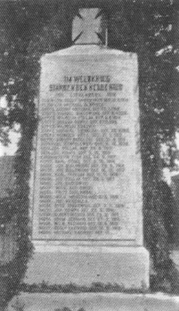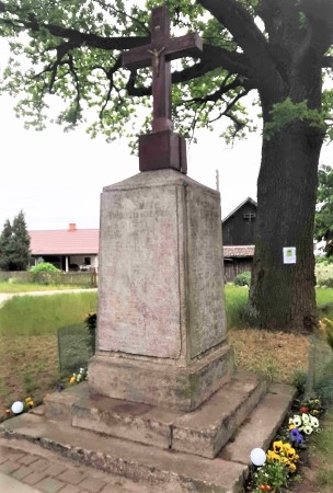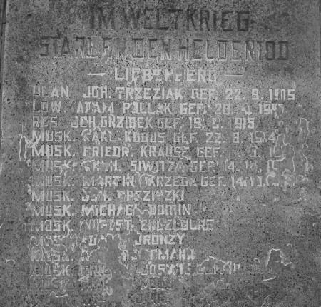 Nach 1945 wurde in Ostpreußen die deutsche Bevölkerung vertrieben und die meisten Denkmäler abgerissen, beschädigt oder umgewidmet. Hier wurde das ganze Denkmal nach 1945 mit einer Masse verkleistert. Sie ist aber in Teilen abgeblättert, so dass einige Namen mit Hilfsmitteln ablesbar sind. Unklare Namen konnten teilweise aus den offiziellen Verlustlisten des
