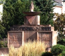 Erinnerungsmal an antifaschistische Widerstandskämpfer: OdF-Denkmal, Rochlitzer Porphyrtuff. Das Mahnmal besteht aus einem Postamentblock mit zwei abgesetzten reliefierten Schriftflächen. Über zwei nebeneinander angeordneten Namensfeldern, die die Namen von 15 ermordeten Widerstandskämpfern enthält (teilweise durch Vandalismus unleserlich), steht die Inschrift.