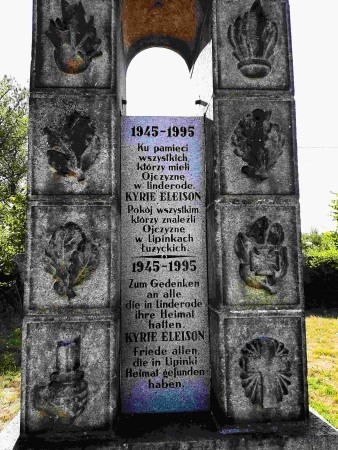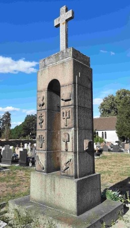 Denkmal für die Gefallenen des Ersten Weltkriegs auf dem Friedhof: Zentrale abgestufte Stele, die innen bogenförmig durchbrochen und mit vielen kriegerischen Motiven verziert ist. Sie wurde früher von einem Adler gekrönt und von sechs großen Namenssteinen halbkreisförmig umrandet. Adler und Nametafeln fehlen heute, ein christliches Kreuz wurde aufgesetzt und eine zweisprachige Tafel in den Durchbruch montiert.
