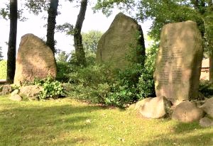 Vor der Kirche/Friedhof bzw. vor der Feuerwehr auf einem Hügel drei Monolithen mit Namen der Gefallenen beider Weltkriege und Inschrift.
