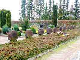 Auf dem Friedhof Kriegsgräber mit elf Steinkreuzen für je zwei Tote.