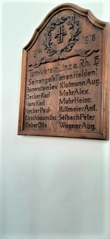 Ehrentafel des Turnvereins Linz am Rhein für die im Ersten Weltkrieg gefallenen Vereinsmitglieder. Die Tafel aus Holz geschnitzt hängt in der Donatus Kapelle in Linz.