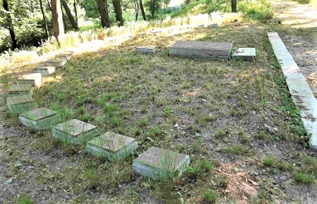 Auf dem katholischen Teil nebeneinander im Quadrat abgelegte Metall-Grabplatten, umschlossen von deiner Hecke. Schlichter kleiner Obelisk für 26 unbekannte russischen Soldaten.
